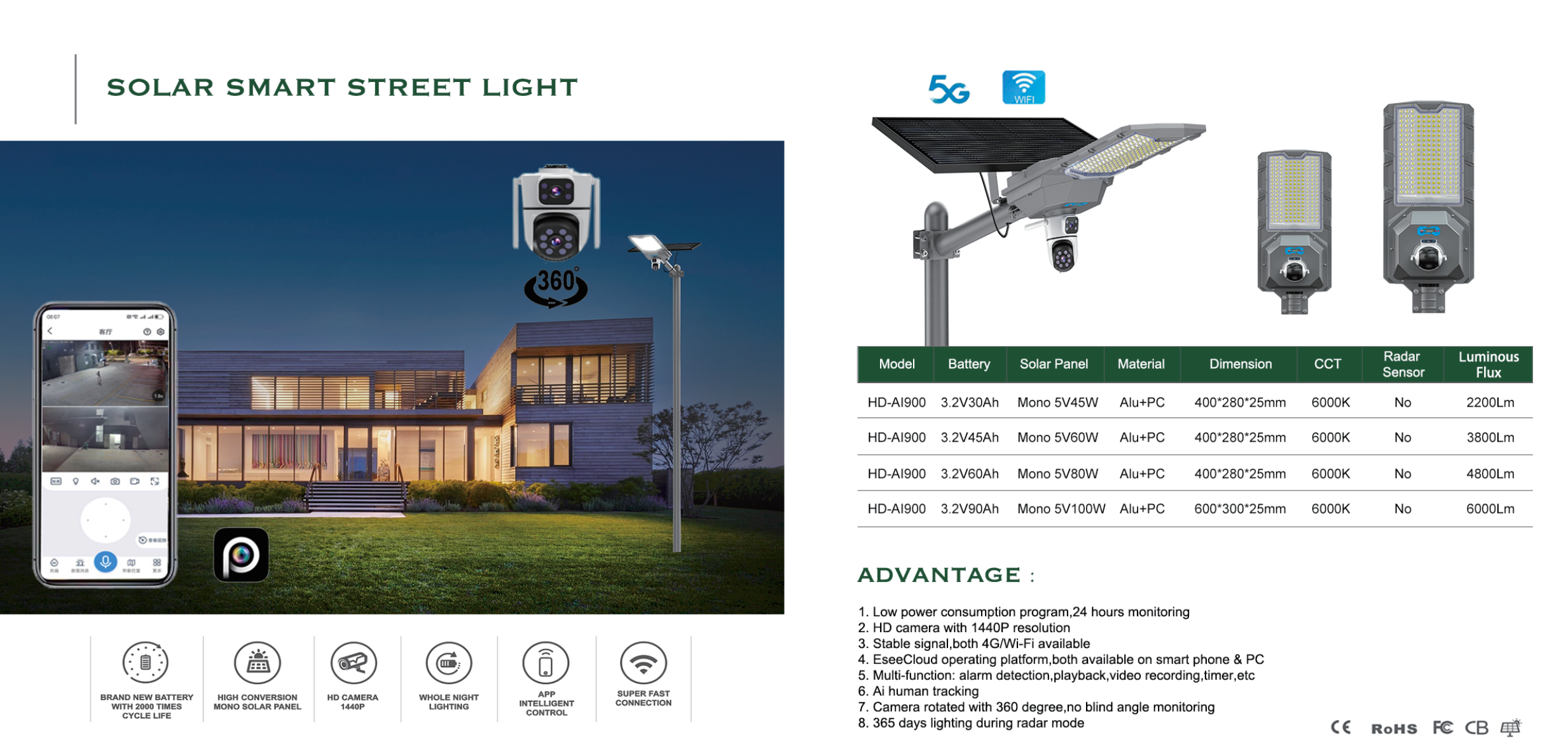 The Solar CCTV Street Light integrates lighting and security monitoring in one smart solution. It uses a safe and stable 3.2V lithium battery system and supports independent mobile APP control for real-time remote management. Available in both Wi-Fi and 4G versions for global use, it requires no wiring and is ideal for roads, villages, farms, construction sites, and other off-grid areas.