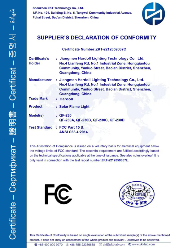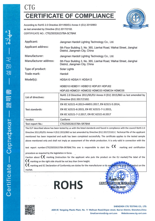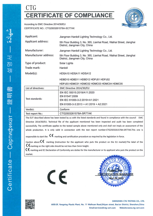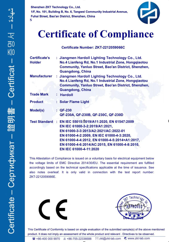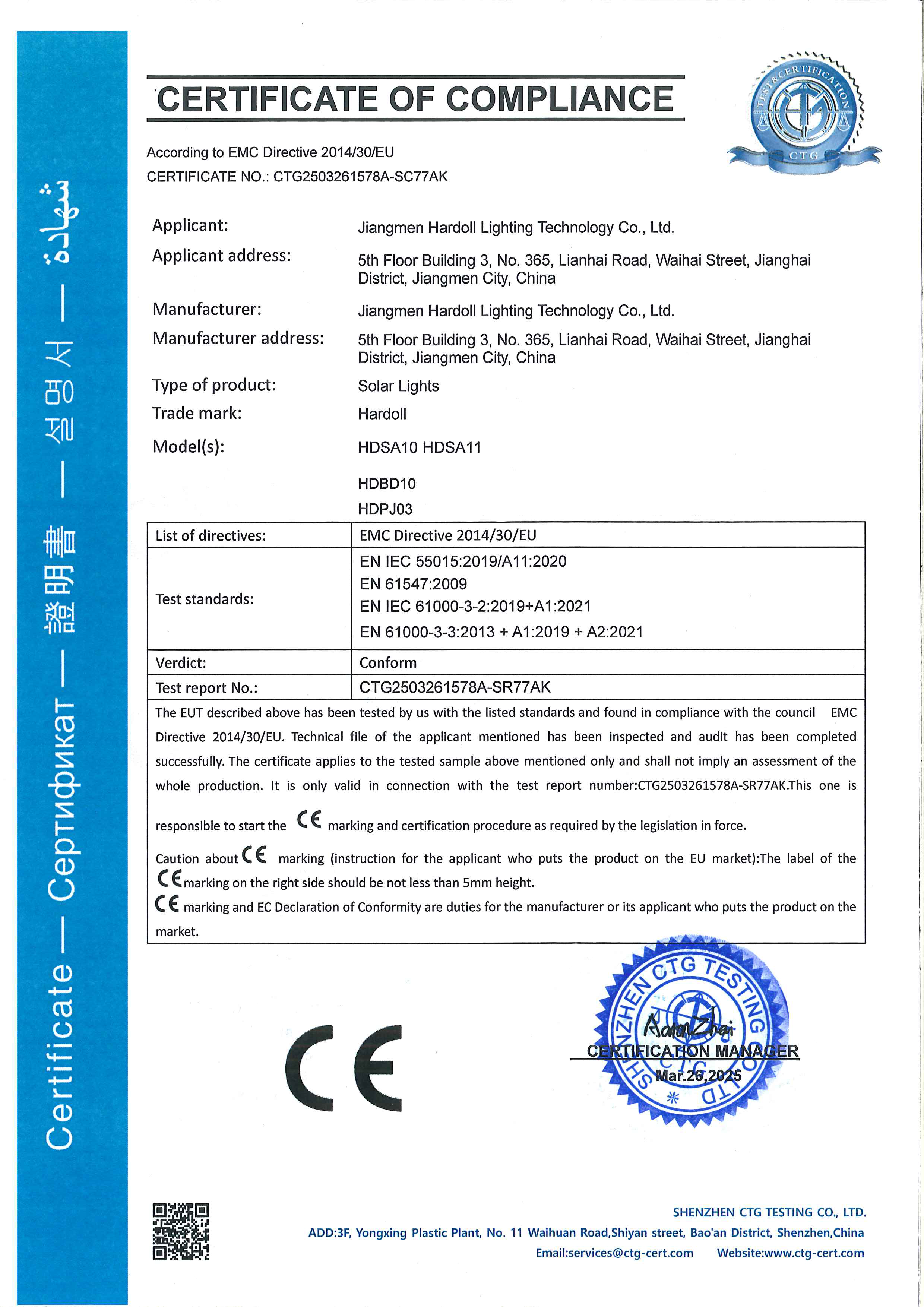 •Hardoll Lighting provides high-quality solar products and solar power solutions to more than 90 countries and regions around the world. The company actively participates in relevant international and domestic quality standard certifications. At present, its products have passed ISO9001 quality system certification and ISO14001 environmental system certification, and have obtained CE, ROHS, UL, FCC and other international certification standards.